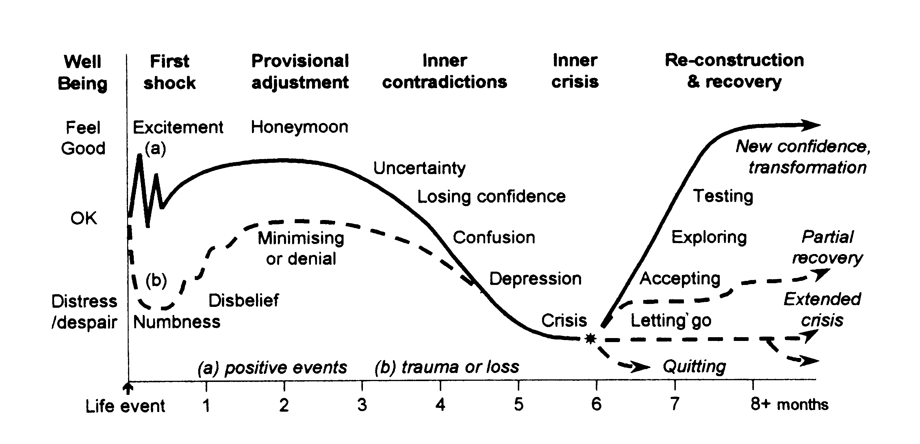 It contains this diagram. I usually hate this kind of thing but found this one quite engaging. It explores how we respond to shocks; I’m intrigued by the parallel paths of responding to both good news and bad. It comes from this paper.