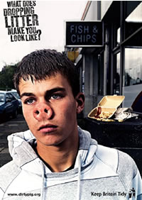 This is the ad they’re putting on bus shelters across London. To me it says: litter is caused by male teenagers and they are pigs.